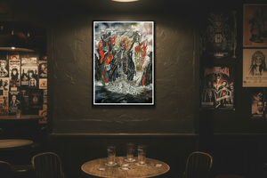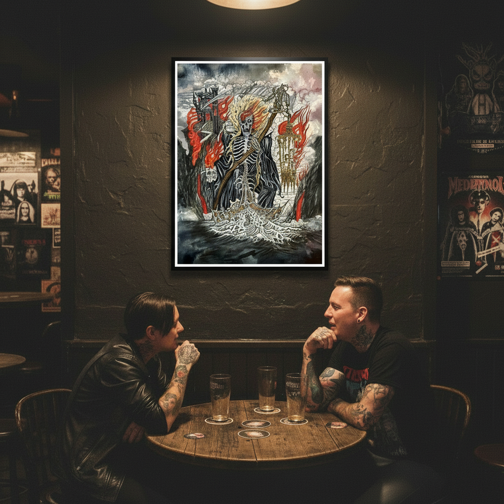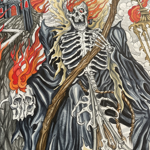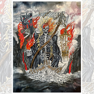 The Reaper’s Keep is a dramatic, high-impact fine-art giclée print showcasing Aaron Hodges’ signature dark, atmospheric style. This piece blends gothic architecture, skeletal symbolism, roaring flames, and storm-filled skies into a powerful narrative scene filled with motion and depth.