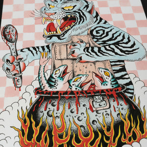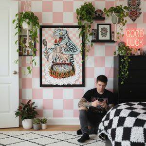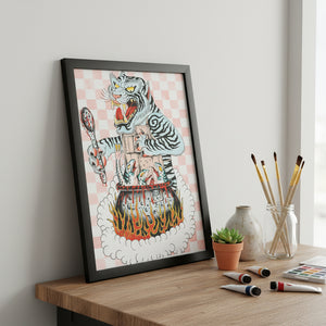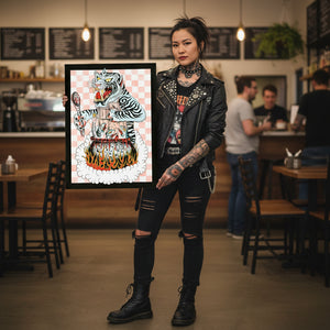 Carnivore” by Alex Q is a striking watercolor illustration inspired by the bold aesthetics of traditional tattoo art. Known for blending dynamic linework with expressive washes of color, Alex Q brings a raw, organic energy to this piece. Printed as a high-quality art reproduction, this piece is perfect for collectors of tattoo-inspired illustration and contemporary flash art.