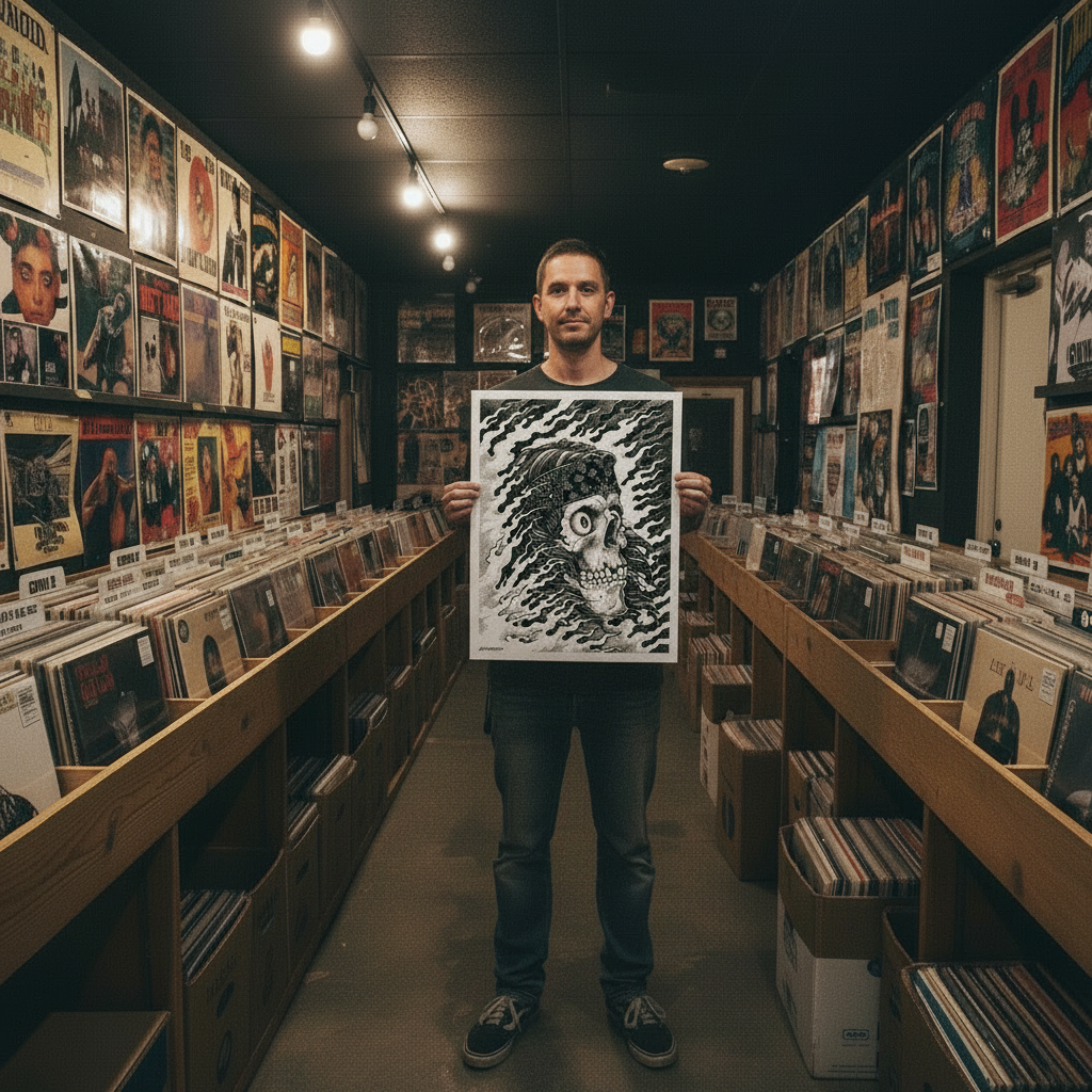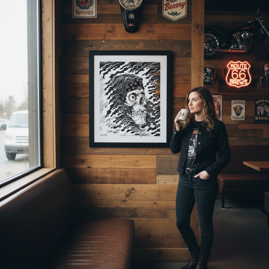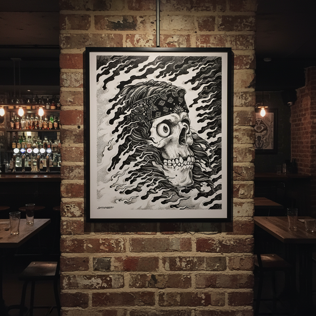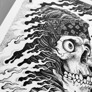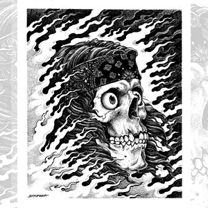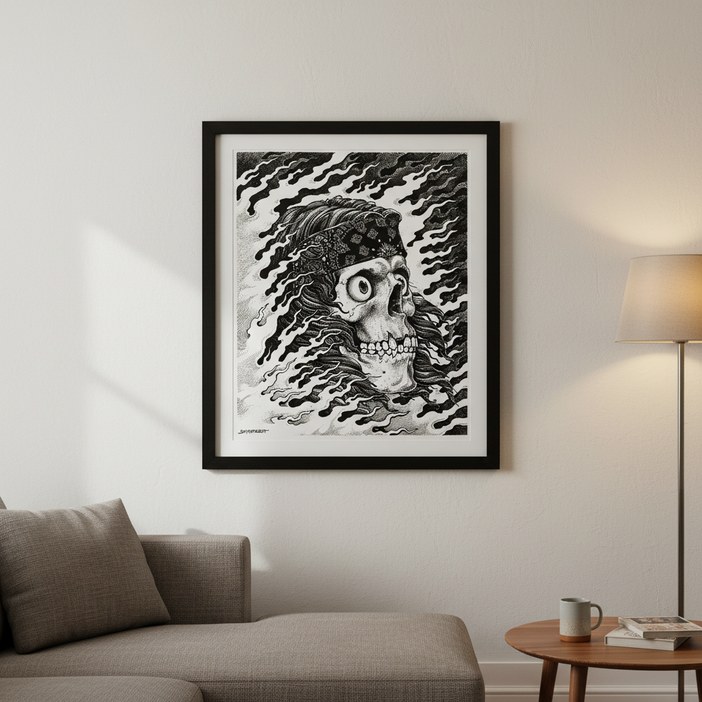 Printed using archival, lightfast pigment inks, this piece delivers deep blacks, crisp highlights, and long-lasting contrast designed to resist fading for decades. The giclée process ensures that all fine details in the skull, flames, and linework are reproduced with remarkable precision.