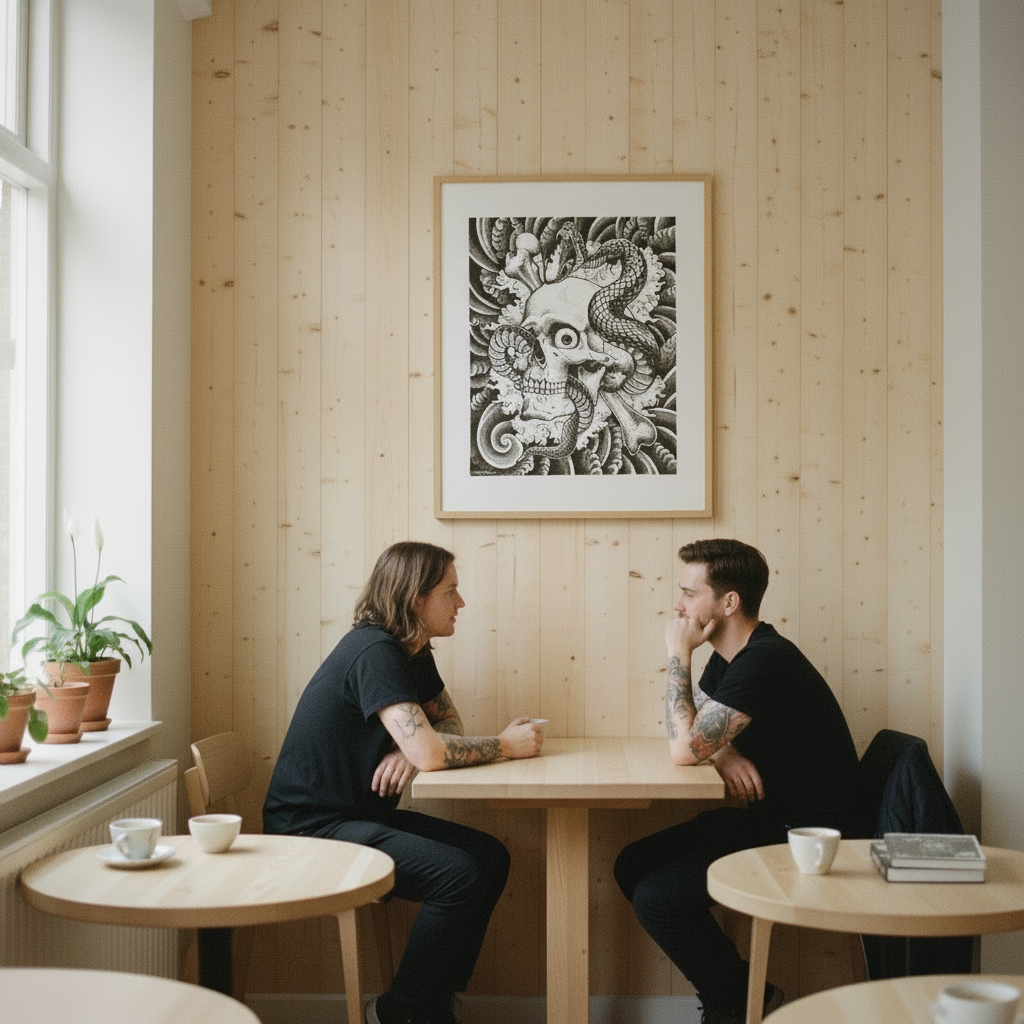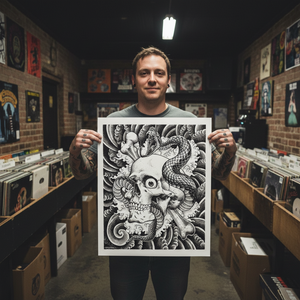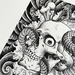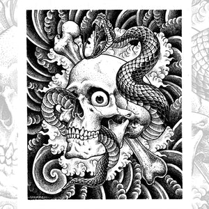 Printed with archival, lightfast pigment inks, this monochrome print offers exceptional longevity and crisp contrast that will stay vibrant for decades. The meticulous giclée process ensures every serpentine curve, skull contour, and fine line is reproduced with stunning precision.