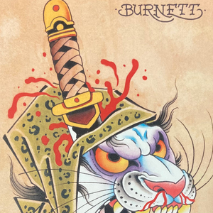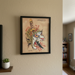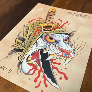 Blood Cat by tattoo artist Devin Burnett (Empire Tattoo, Asheville NC) is a bold, dramatic illustration with blood rendered in vivid detail. This striking piece combines dark, edgy imagery with traditional tattoo-style artistry, perfect for collectors of neo-traditional, tattoo-inspired, and intense illustrative art.