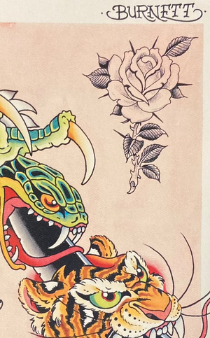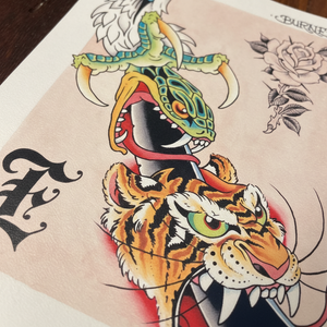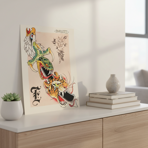 “Creature Kabob” by Devin Burnett blends classic American traditional tattoo motifs into a bold stacked composition featuring dynamic animal forms and crisp ornamental details. Printed as an 11×14 giclée on 340gsm Epson Cold Press with archival, lightfast pigments, it offers rich texture and long-lasting vibrancy. Each print is professionally produced at Mindzai Creative in Austin, Texas for exceptional quality.