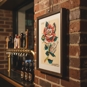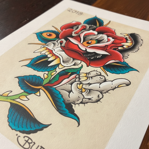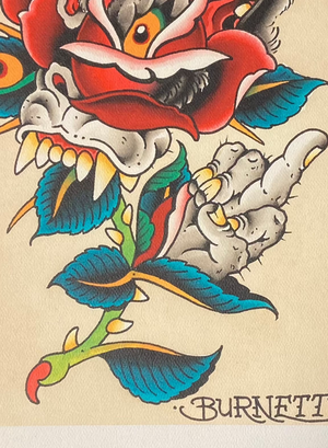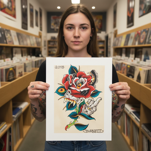 “Rose Morph” by Devin Burnett blends classic American traditional tattoo style with surreal, creature-like detailing for a striking and imaginative composition. Printed as an 11×14 giclée on 340gsm Epson Cold Press using archival, lightfast pigments, it delivers rich texture and long-lasting vibrancy. Each print is professionally crafted and produced by Mindzai Creative in Austin, Texas.