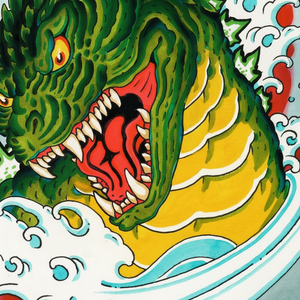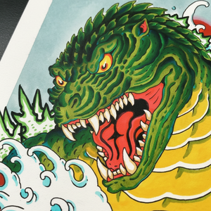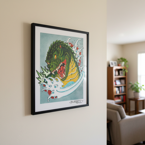 Rich colors, bold linework, and atmospheric water effects bring the scene to life, making it a standout piece for collectors of kaiju and fantasy art. Printed with archival, lightfast pigments on premium fine art paper, it offers long-lasting vibrancy and professional display quality.