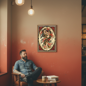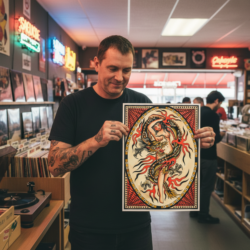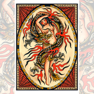 Printed in-house at Mindzai Creative on archival fine-art paper, this striking flash painting stands as a dramatic centerpiece for collectors, tattooers, and lovers of classic tattoo mythology.