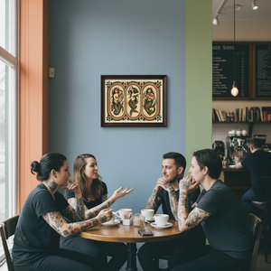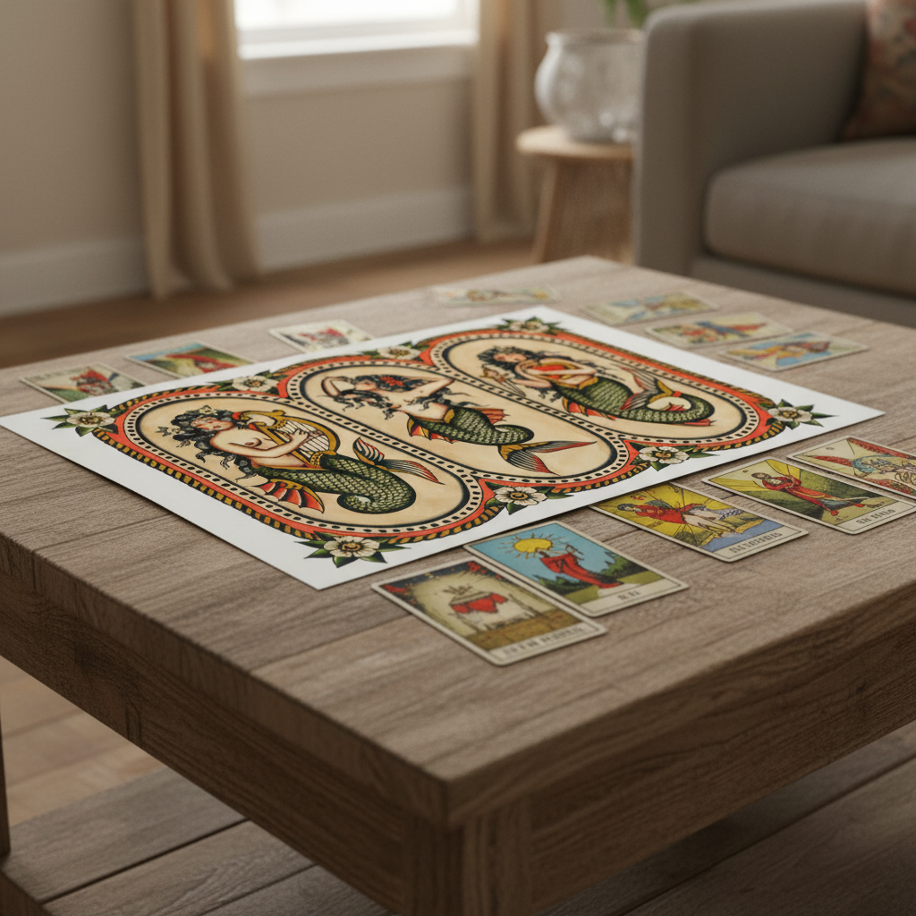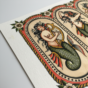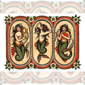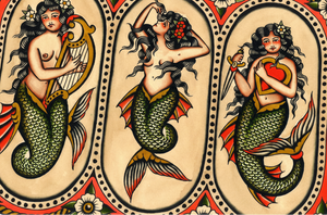A trio of timeless sirens brought to life by Gaia Zeta, this traditional mermaid flash sheet blends mythic beauty with bold, classic tattoo sensibility. Each mermaid embodies a different force of the sea — song, allure, and devotion — rendered with meticulous detail, rich color, and a reverence for vintage tattoo tradition.