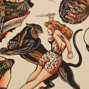 This sheet features bold jungle iconography and pulp-era adventure energy: