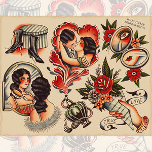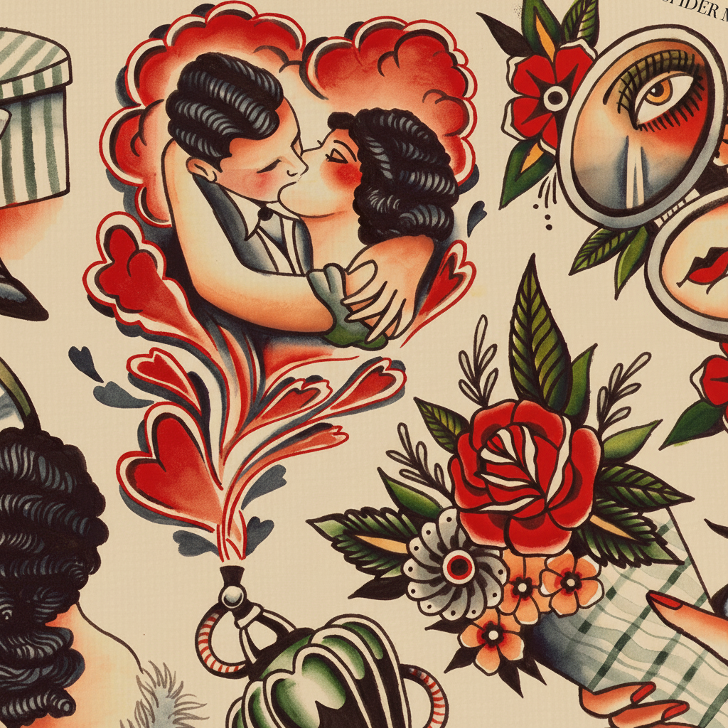This set features classic motifs including roses, mirrors, perfume bottles, lovers, and ornamental accents — all executed with refined linework and rich traditional color palettes. A perfect addition for collectors, tattooers, and lovers of true traditional style.