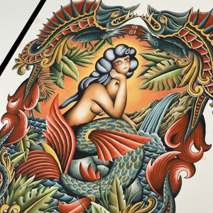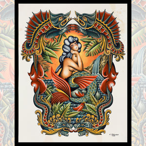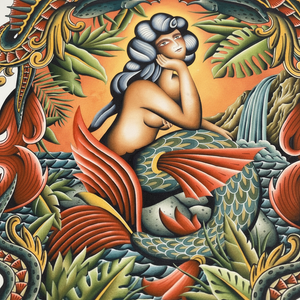 “Siren Song” is a stunning showcase of Laurent Trelaun’s richly layered traditional style. The central siren is framed by lush foliage, vibrant scales, and fierce sea creatures, all rendered with Trelaun’s signature bold palette and ornamental detailing. A powerful fusion of myth, beauty, and classic tattoo storytelling