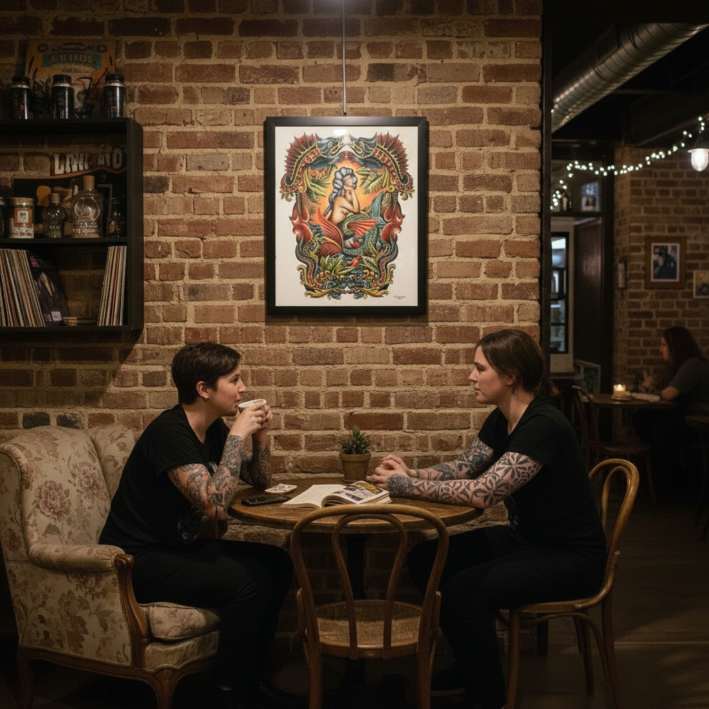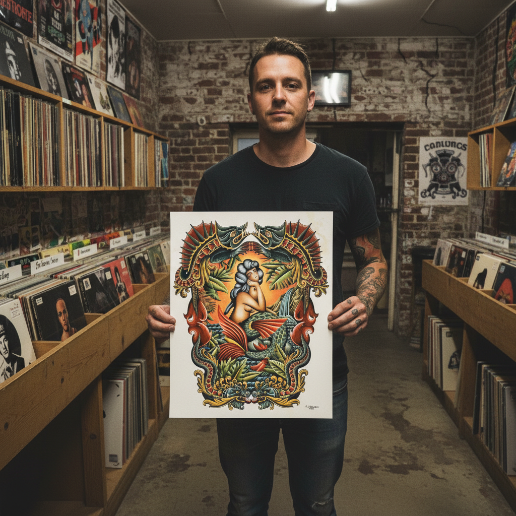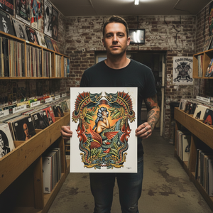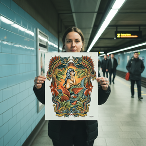 Printed in-house as a premium fine-art giclée using archival methods at Mindzai Creative on archival fine-art stock, this piece stands as both flash and fine art — a dramatic, romantic centerpiece for collectors and tattooers.