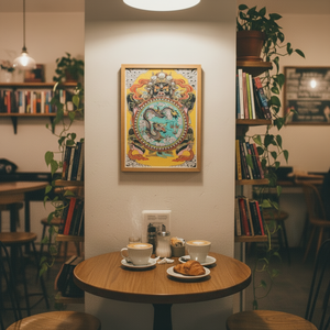 “Wheel of Life” by Lorenzo Rossi of Good Tattoo Parlour is a vibrant, highly detailed piece inspired by traditional Eastern motifs. This giclée print features bold linework, mythic symbolism, and a dynamic central dragon framed within an ornate circular design.