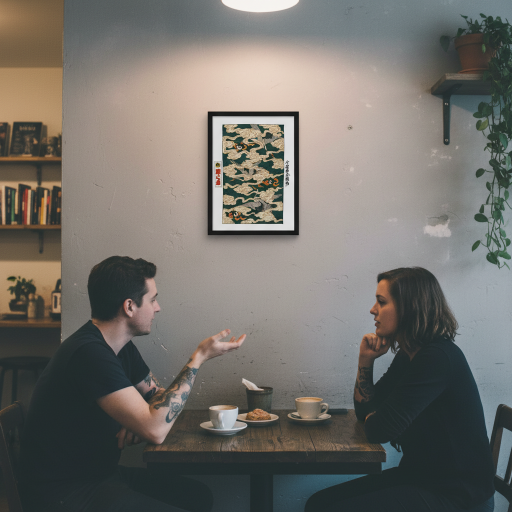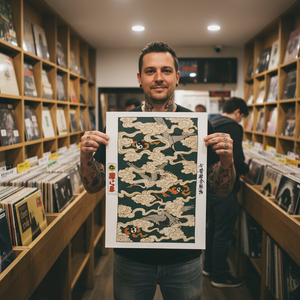A timeless and elegant composition from Stewart Robson, “Cranes” blends classical Japanese aesthetics with Robson’s razor-sharp linework and flowing movement. The swirling clouds, cranes in flight, and subtle gold textures create a serene yet powerful visual rhythm — a perfect representation of Robson’s mastery of traditional motifs.