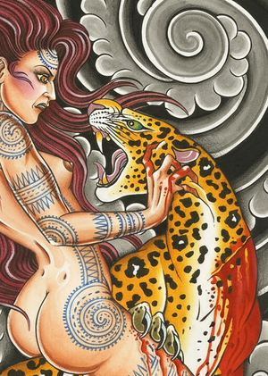 “Kitty Claws” by Valerie Vargas is a fierce and electrifying art print that merges primal energy, tattoo tradition, and mythic femininity.