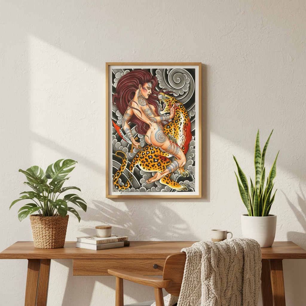 Printed in-house as a premium fine-art giclée using archival methods at Mindzai Creative on archival fine-art stock, this piece stands as both flash and fine art — a dramatic, romantic centerpiece for collectors and tattooers.